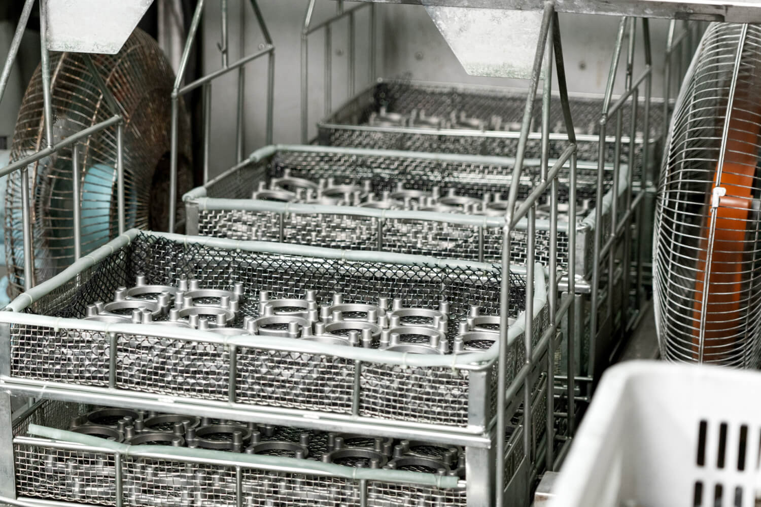 Aluminum die cast rings organized in stainless steel baskets for high-volume automated cleaning and surface preparation before final coating.